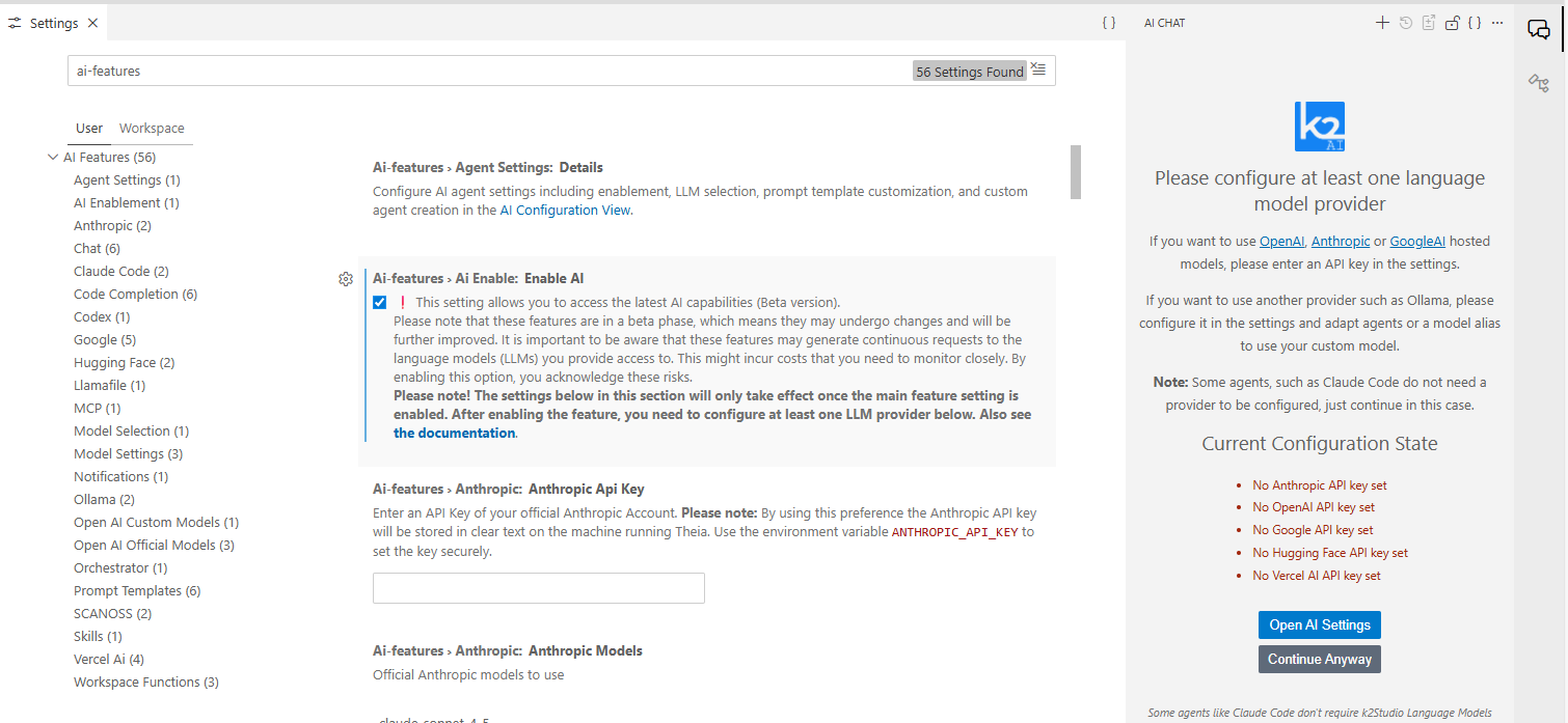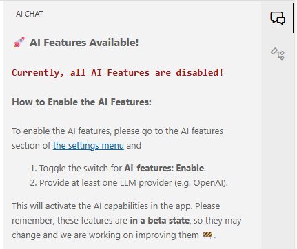 First launch - The panel shows a setup guide prompting you to enable AI features and configure an LLM provider.