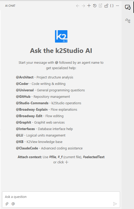 #_f — attaches the currently open file.#selectedText — attaches the text currently highlighted in the editor.#file:path/to/file — attaches a specific file by path.For a complete guide to context, including drag-and-drop and the paperclip button, see Using the AI Chat.
