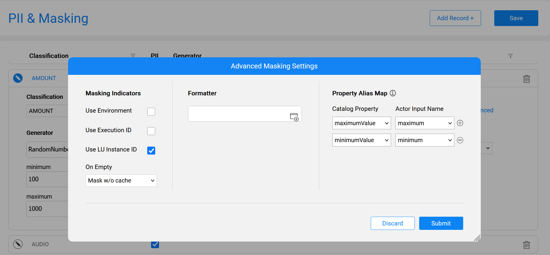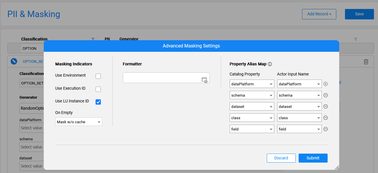 Then, in the Catalog Settings > PII & Masking tab, open the relevant classifications and click the Advanced link to set up the Property Alias Map between the Generator's inputs and the Catalog's calculated properties: