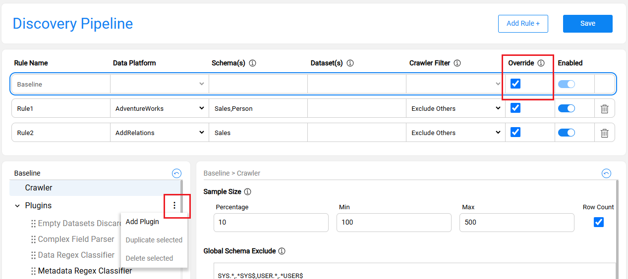 Click Override on the Baseline rule to create a custom pipeline configuration.