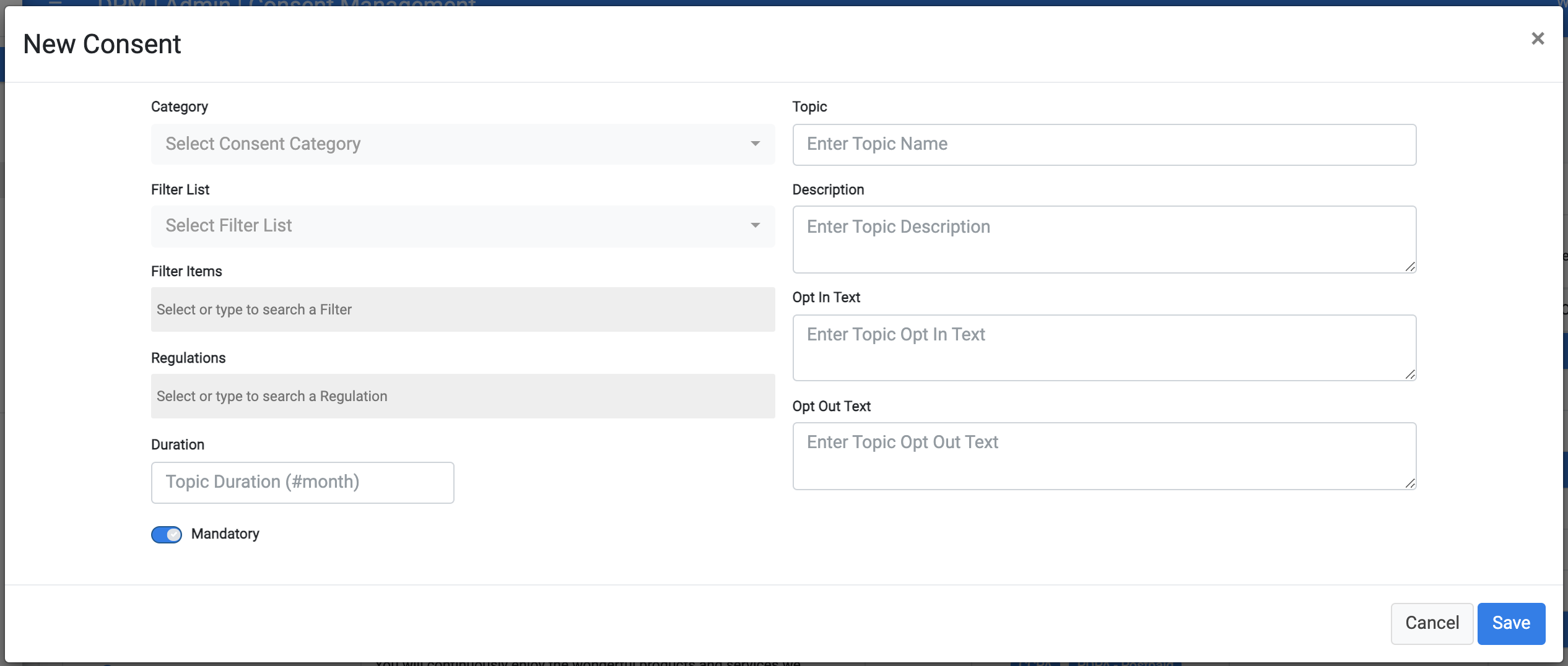 If a consent topic is defined as mandatory, it means that the consent would be presented to the customer as on (opt-in) and the customer cannot opt-out from this consent.