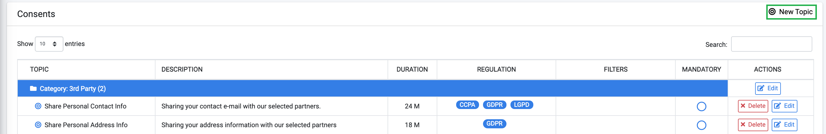 button at the top-right of the screen in order to configure a new consent topic.