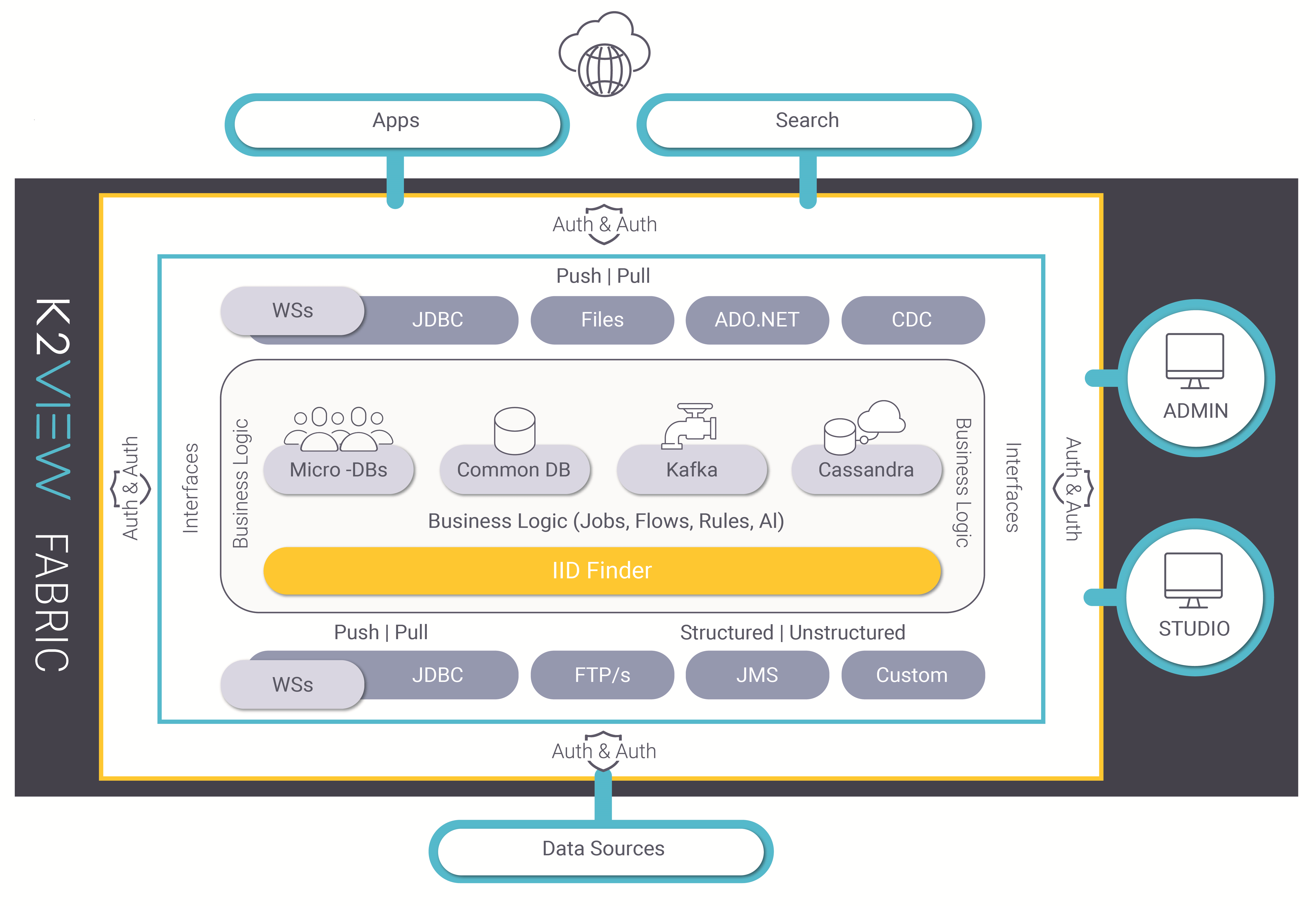 Data flows in and out of Fabric via multiple types of interfaces and data formats. Fabric users can use multiple configurations between their data-supplying and data-subscribing systems. Connection flexibility is essential for Fabric to integrate data spread across multiple databases and data centers, to generate its uniquely patented Data Product MicroDBs, to allow any type of data transformations per the required business flow design and to expose the data to 3rd party systems. Both data push and data pull modes are supported between Fabric and any external systems.