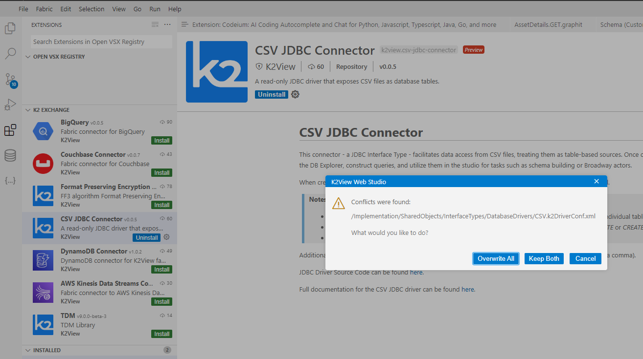 - Overwrite All - replace the existing files with those included in the extension.