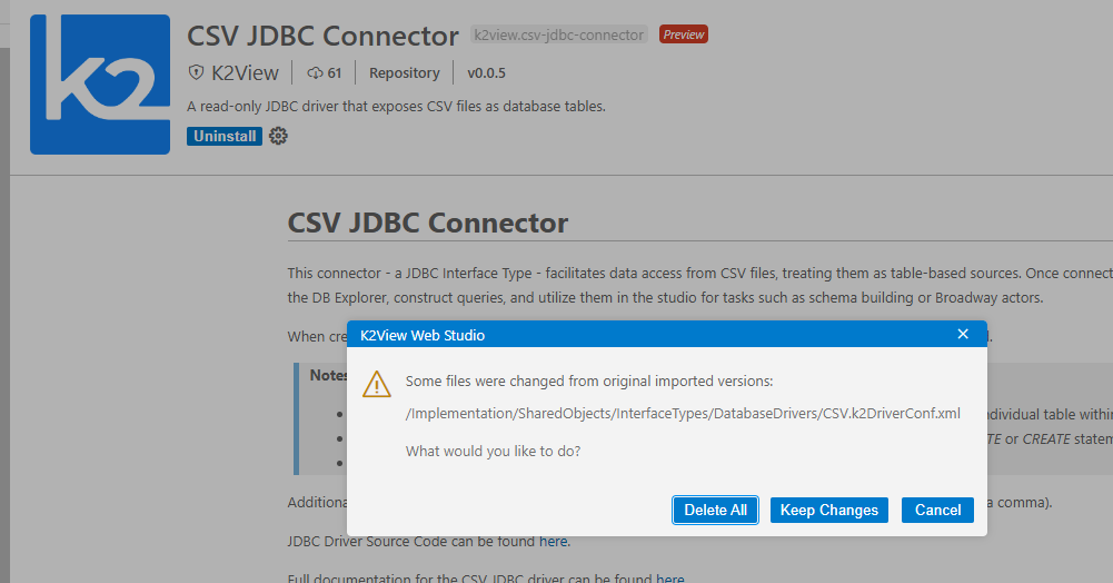 While changing the extension version, there is a possibility that changes that have been made would be deleted. In such case, you will be notified, in a similar manner as in the uninstallation process, with the same dialog window, which asks whether you would like to Delete All, Keep Changes or Cancel.
