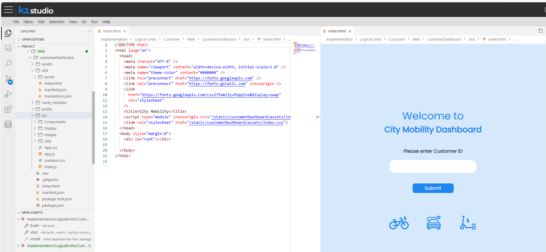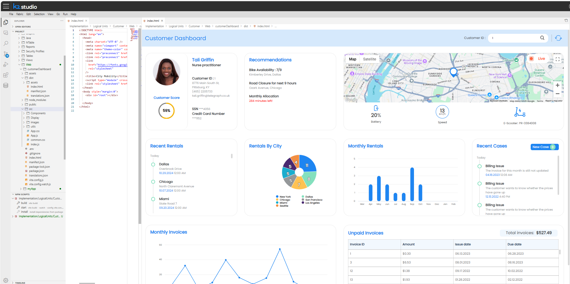 Below are screenshots from our City Mobily C360 Demo project, where its React dashboard web application is developed within the Studio. The web application calls the customized project APIs (Java and Graphit files) that enable retrieval and saving of the data inside the LU. Altogether, this allows for the development, debugging and preview to occur in one single place.