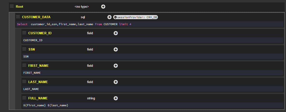 The sessionProvider flag is set to CRM_DB in order to enable direct references to CRM_DB tables and fields.