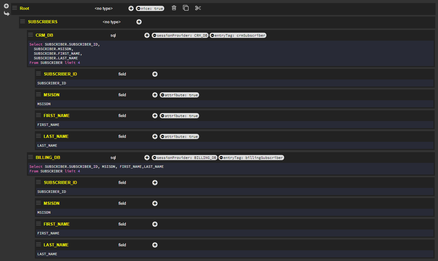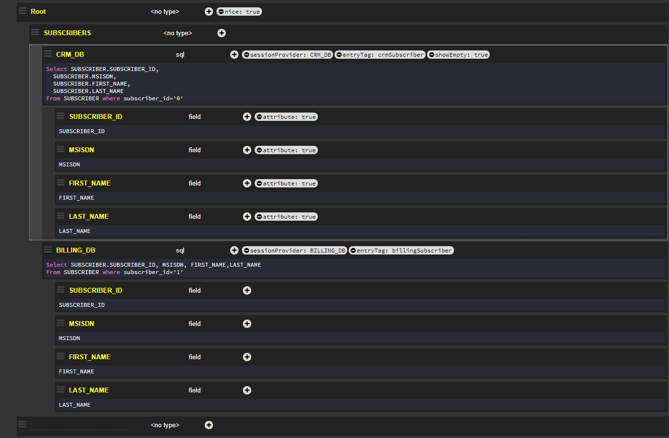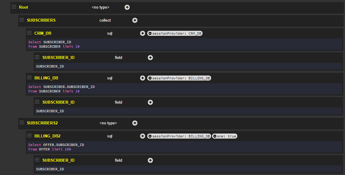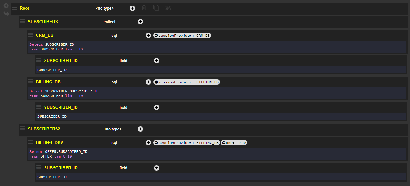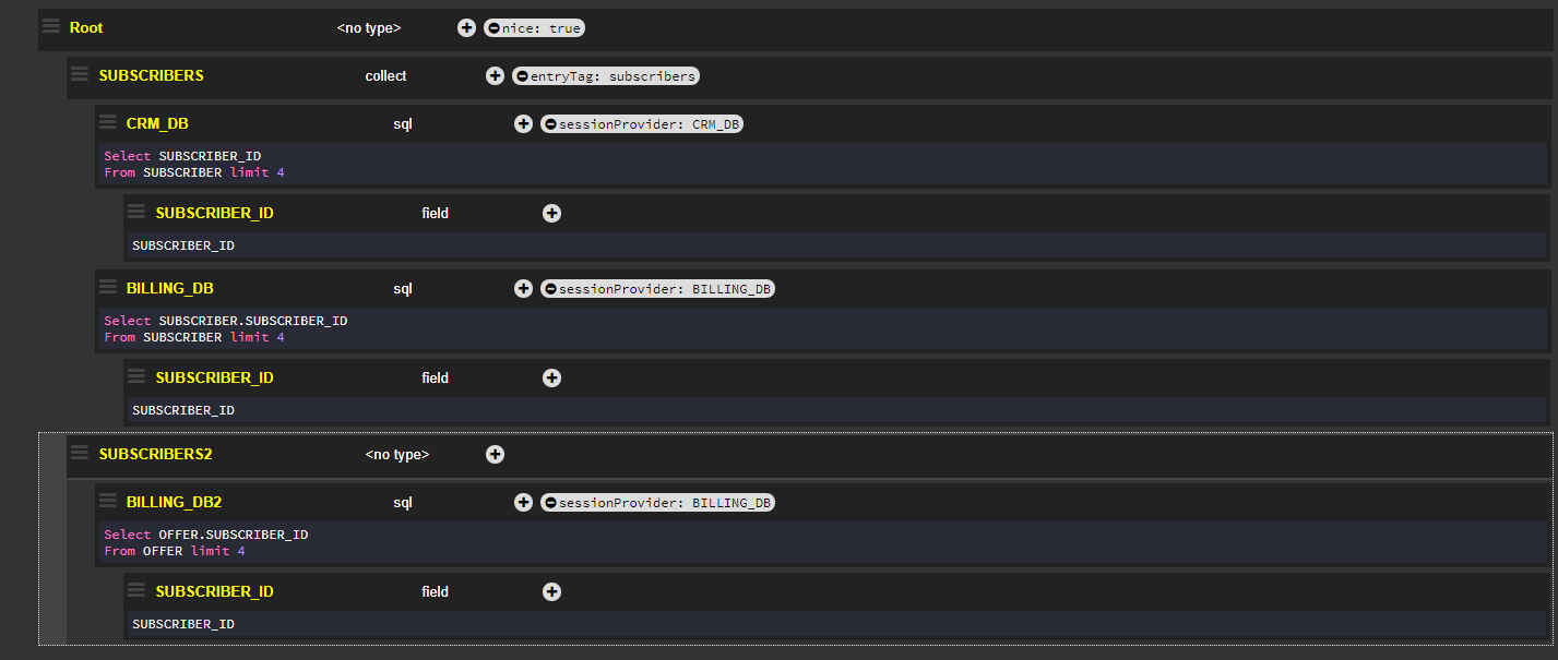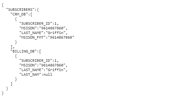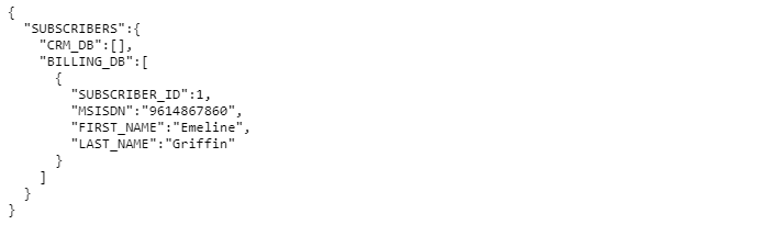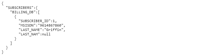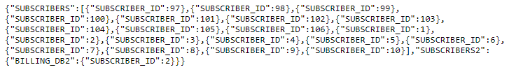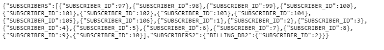 The one flag is set to true and applied to the Billing_DB2 node. As a result, the response returns only the first value for {"BILLING_DB2":{"SUBSCRIBER_ID":2}}, instead of the 10 expected values for this tag if the one flag had not been activated.