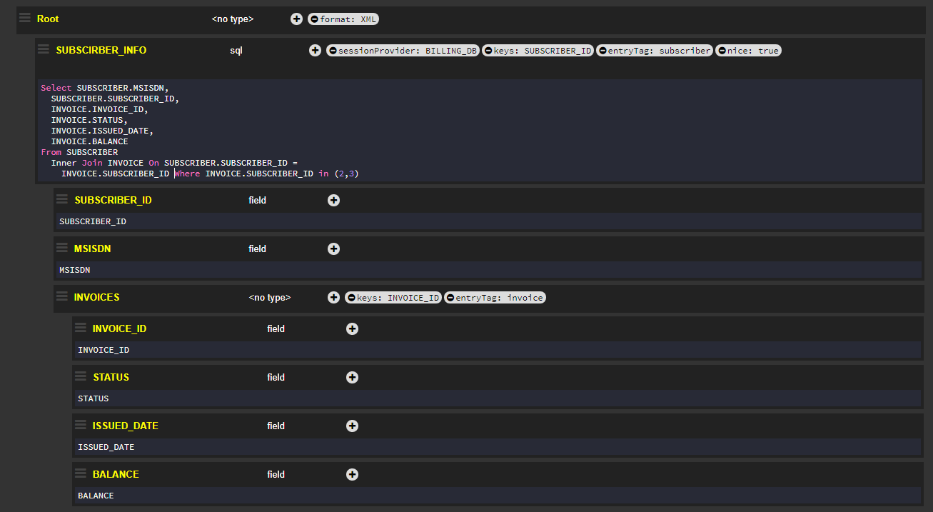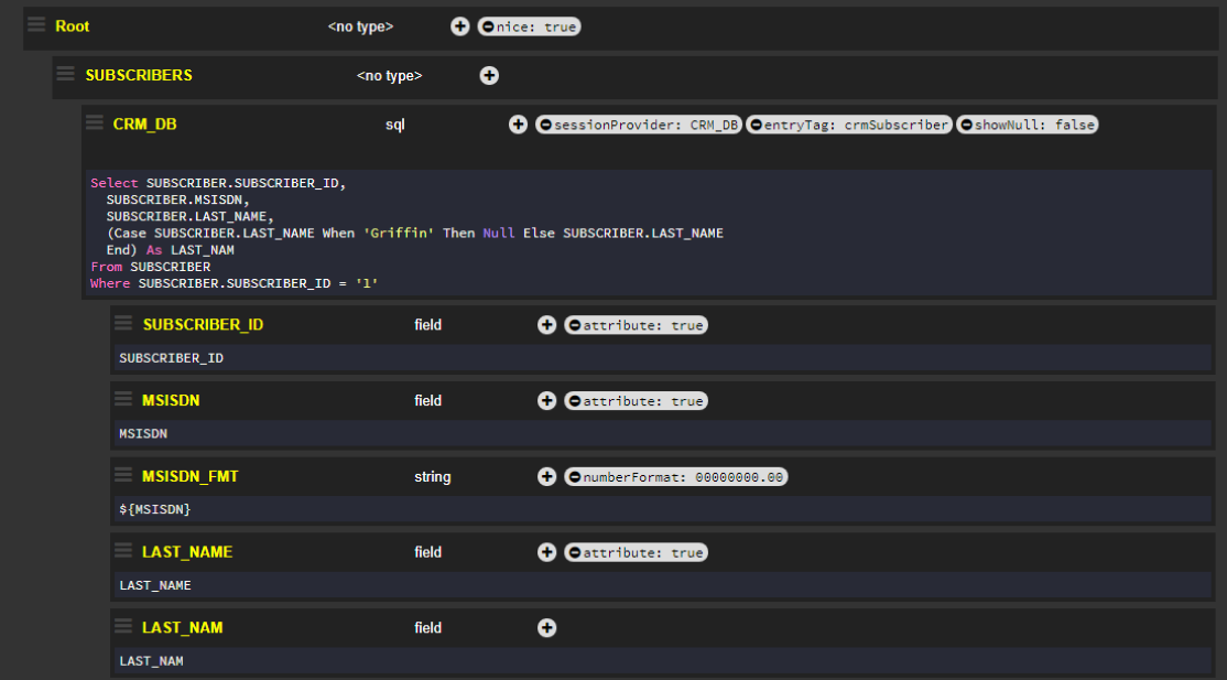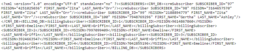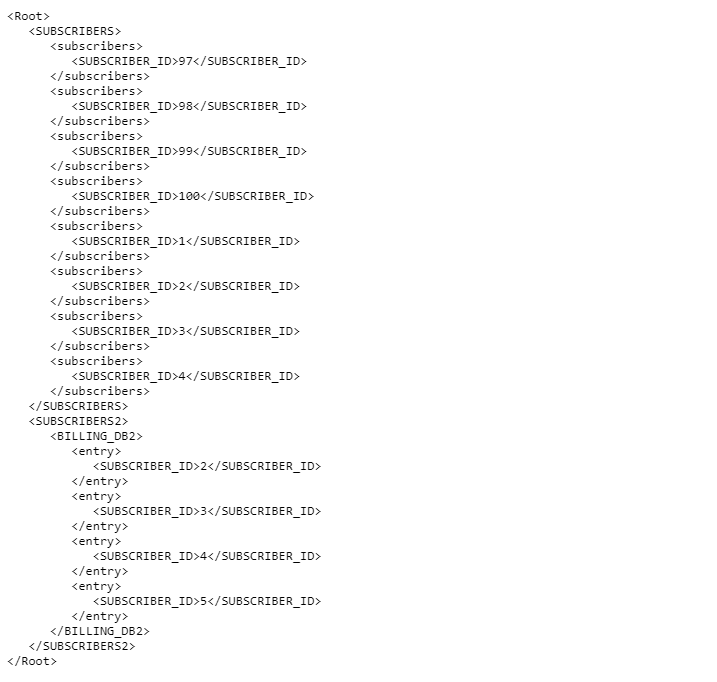 The entry flag has been set to the SUBSCRIBERS node, and therefore, the XML response displays tags around each SUBSCRIBER_ID value.