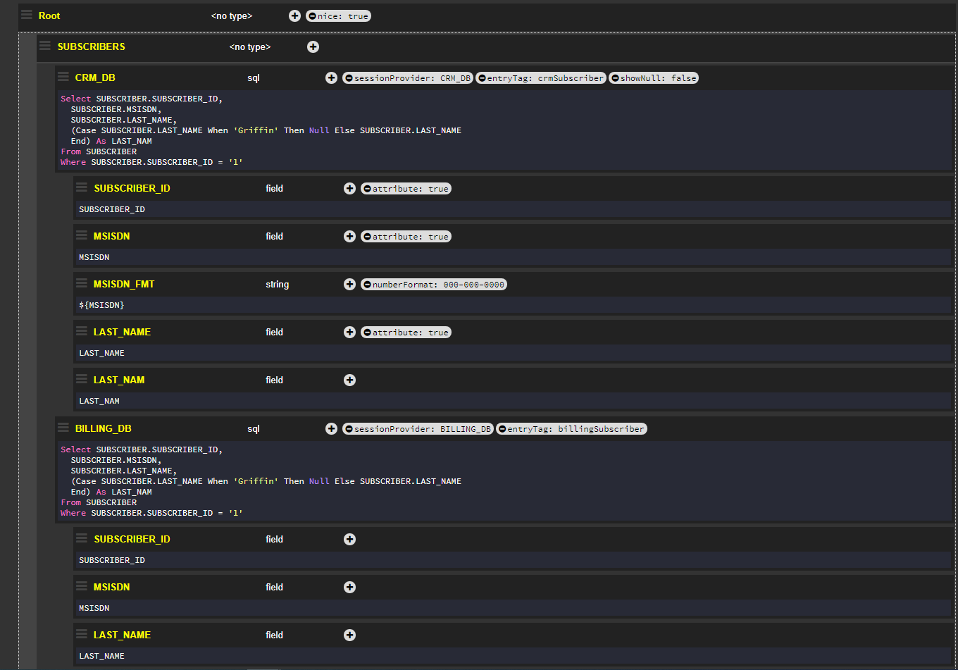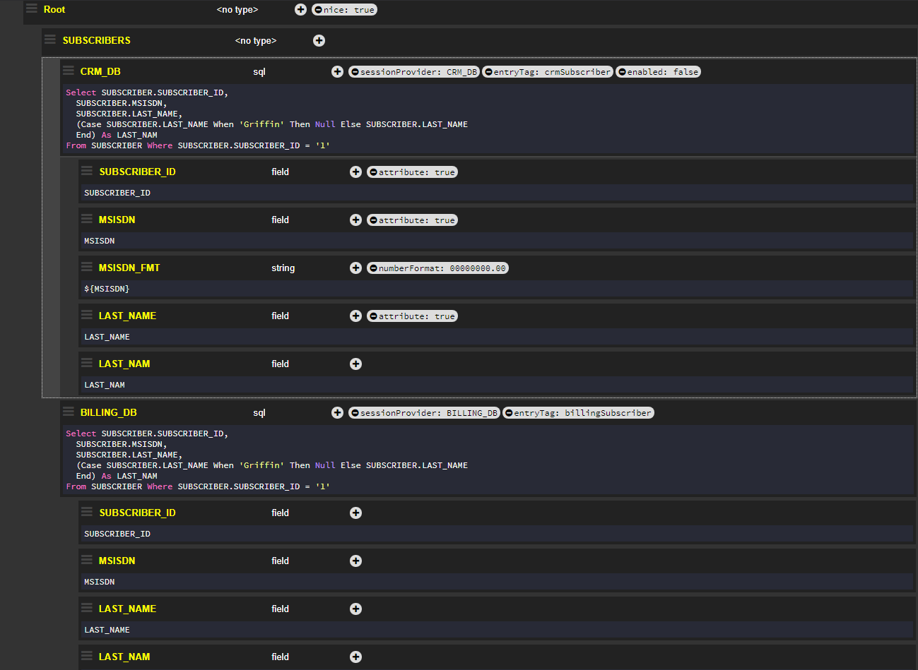 The showNull flag has been set to false and applied to the CRM_DB node. The response does not show the LAST_NAM field in the CRM_DB node because its Null values are ignored and therefore omitted from the CRM_DB section of the response. The flag is not applied to the BILLING_DB node, and therefore Null values are shown.