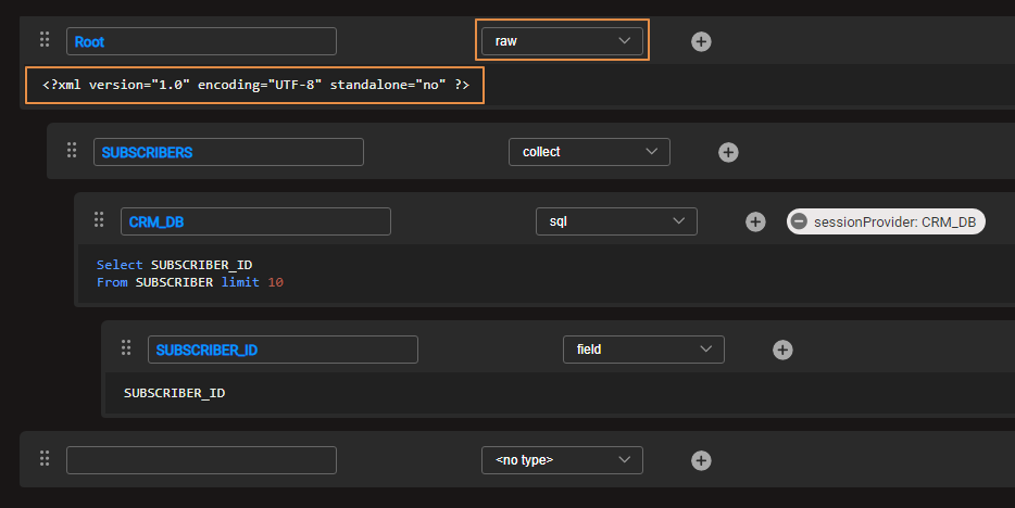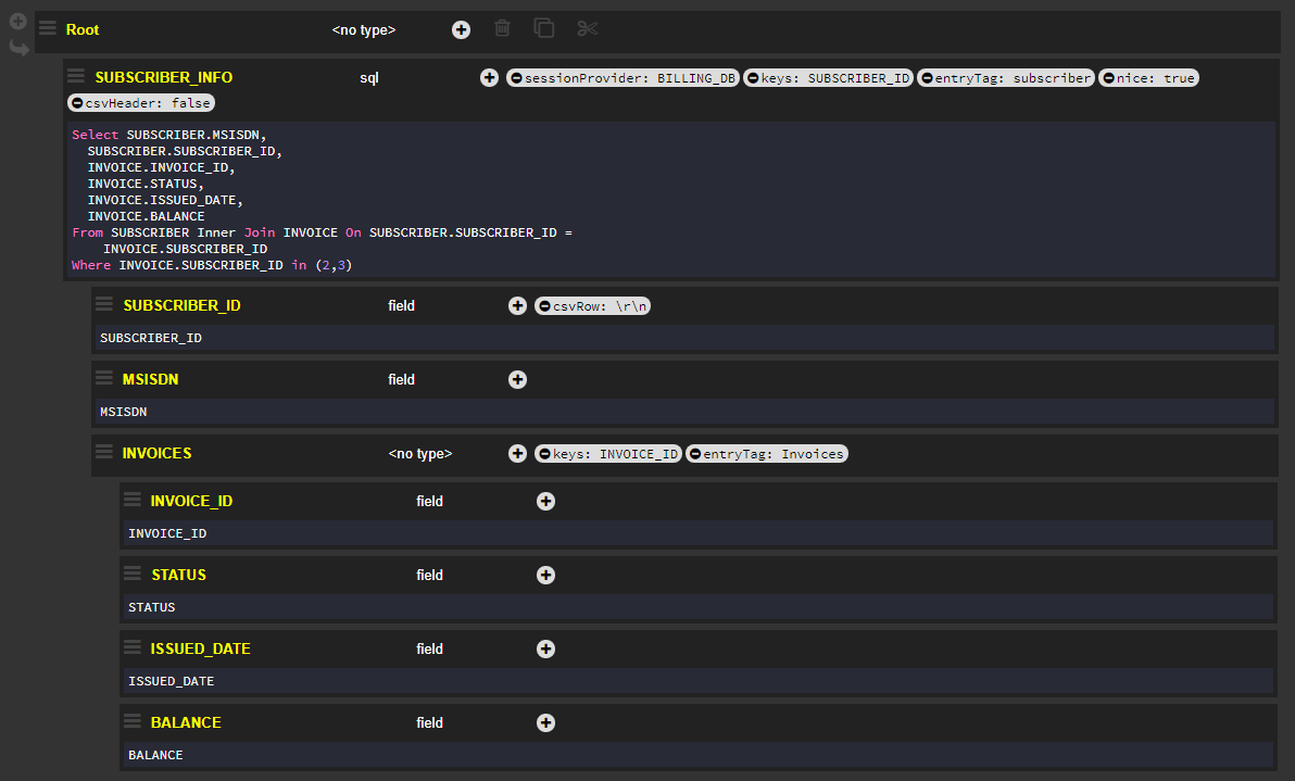 The csvRow has been set to the SUBSCRIBER_ID node. Therefore, a new line has been created for each new subscriber_id entry.