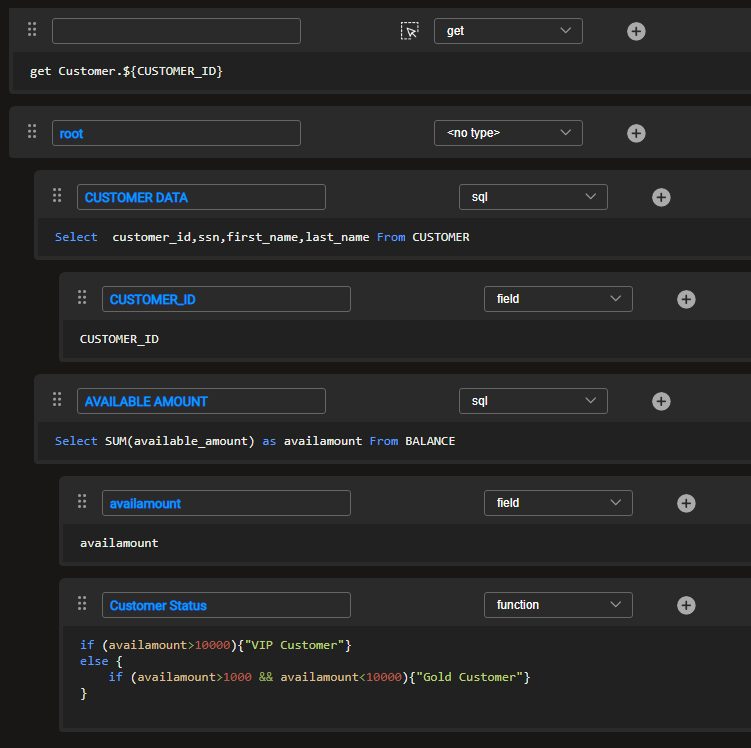The following Graphit file gets an input LUI that extracts customer data from the CUSTOMER LU, calculates its balance and sets its status accordingly.