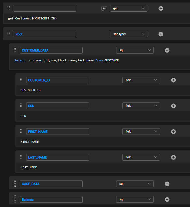 The following Graphit file gets an input LUI that extracts customer data from the CUSTOMER LU, using GET and SQL commands.