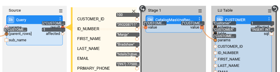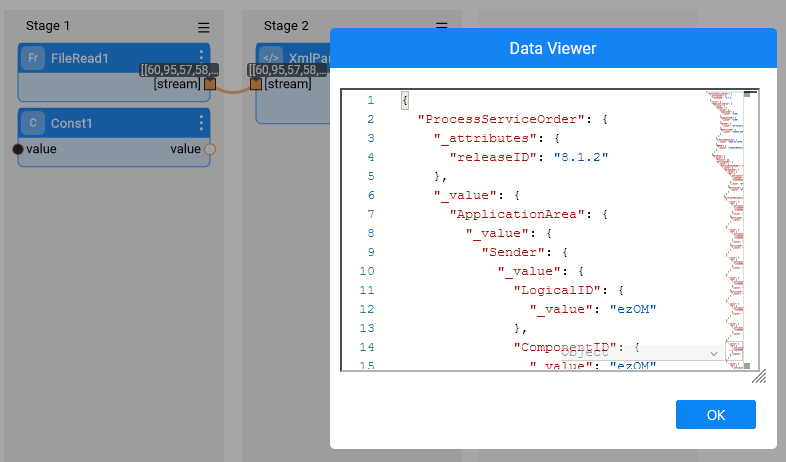 When Debug is ON, the values of the input and output arguments of each executed step are displayed in grey balloons known as Data Viewers. A Data Viewer displays Java objects using a JSON-like visualization of a Broadway map, list and Java primitive data types.
