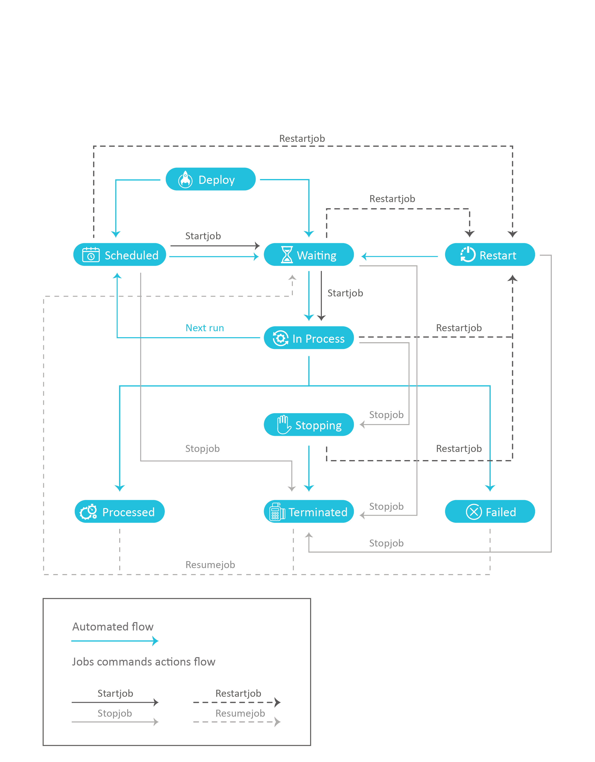 The following image illustrates the different stages of a Job's lifecycle and the different types of actions that transit a specific Job from one specific state to another.