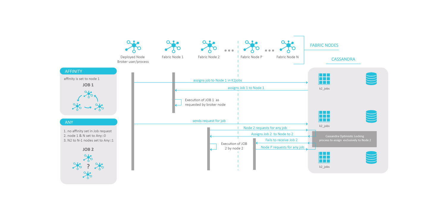 When running multiple Fabric nodes, Jobs can be allocated to different nodes. Once a new Job is automatically or manually started, each node within the Fabric Cluster will compete to execute it. The Fabric internal mechanism ensures an agreement is reached between all nodes and that each Job is executed only once by the best candidate node at any given time. Each Fabric node checks in the k2_jobs table whether a new Job has been deployed and whether it has already been allocated to a node by the internal transactions process or assigned to a specific node by way of affinity.