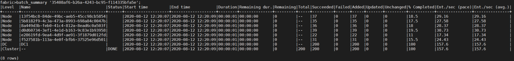 BATCH CUSTOMER.ig10CustomersList FABRIC_COMMAND="sync_instance CUST.?" with async=’true’; This command migrates the customers defined in the ‘ig10CustomersList’ Instance Group into the CUSTOMER keyspace in the Fabric database. |