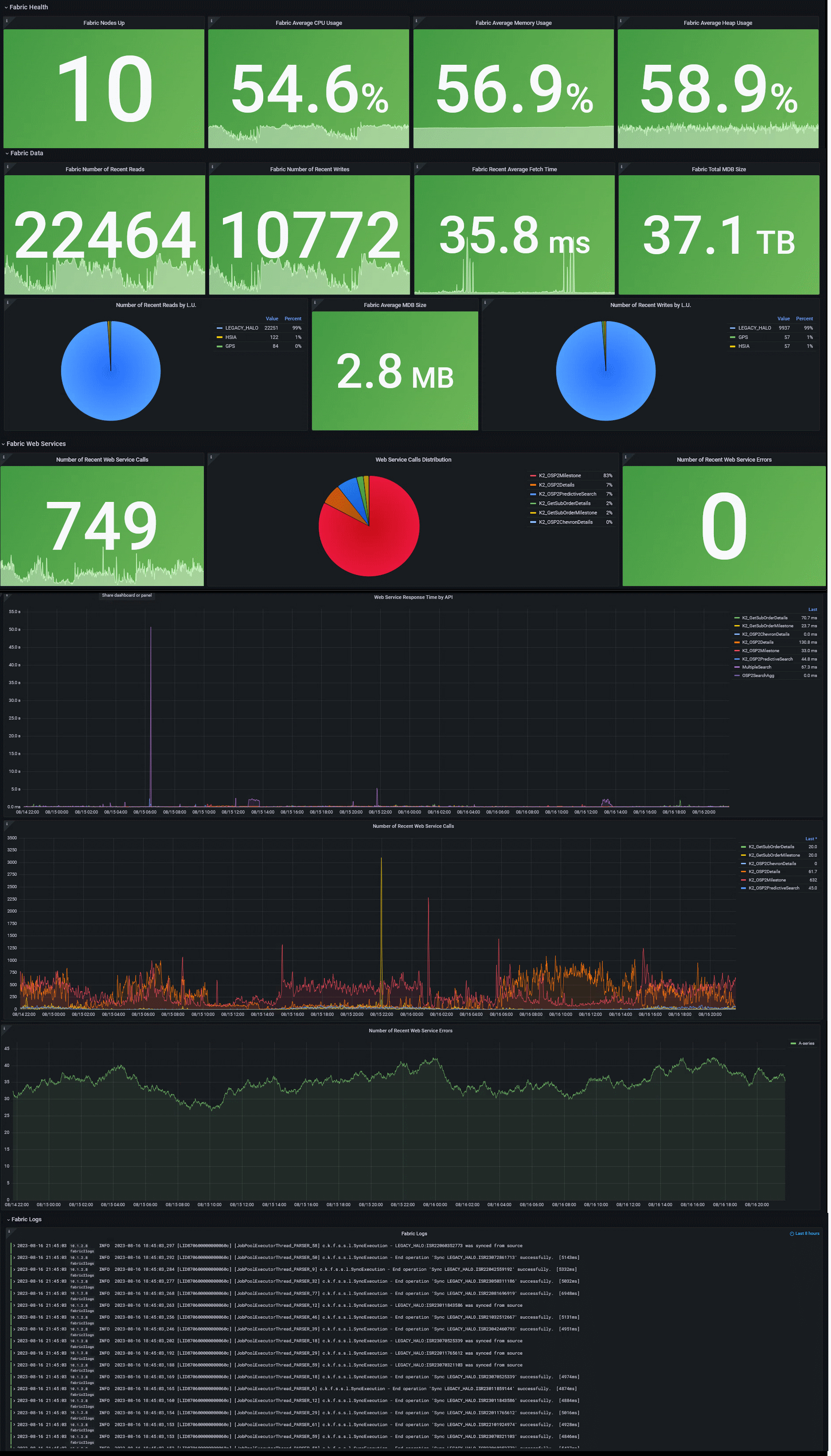 The following example illustrates a basic Grafana dashboard configuration for monitoring K2view Fabric alongside supporting components such as Cassandra and Kafka. It is intended as a reference implementation that customers can extend and adapt to meet their specific operational and business requirements by adding relevant, project-specific metrics.