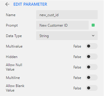 Additionally, you can define the list of the parameter's available valid values and/or its default value. Both types of values can either come from a data set or use hardcoded values.