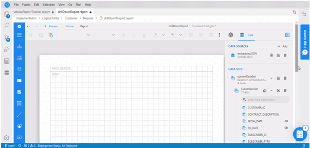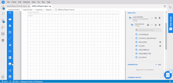 from the report's toolbox. In this case, you still need to connect the table with its respective data set fields - as in the following display: