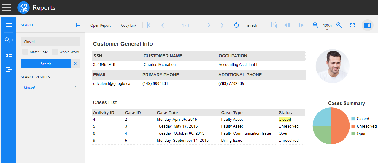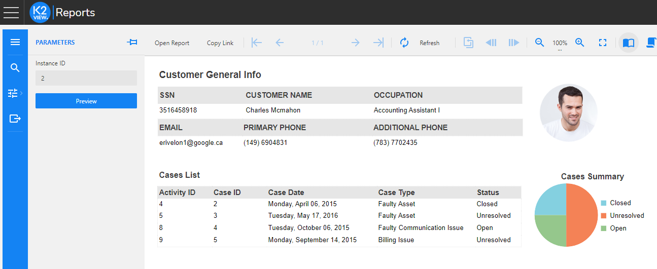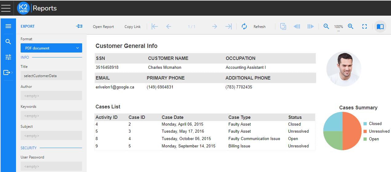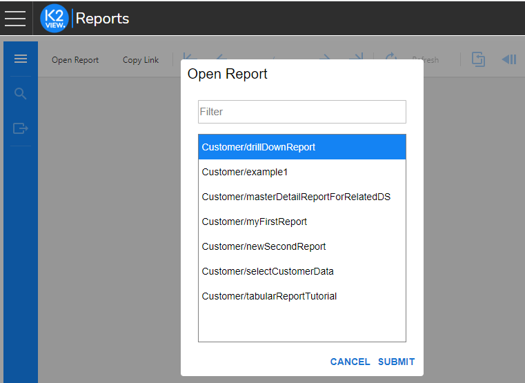 The Report Viewer can be reached by opening Reports from the list of pre-integrated applications of the K2View Web Framework and it enables the following options: