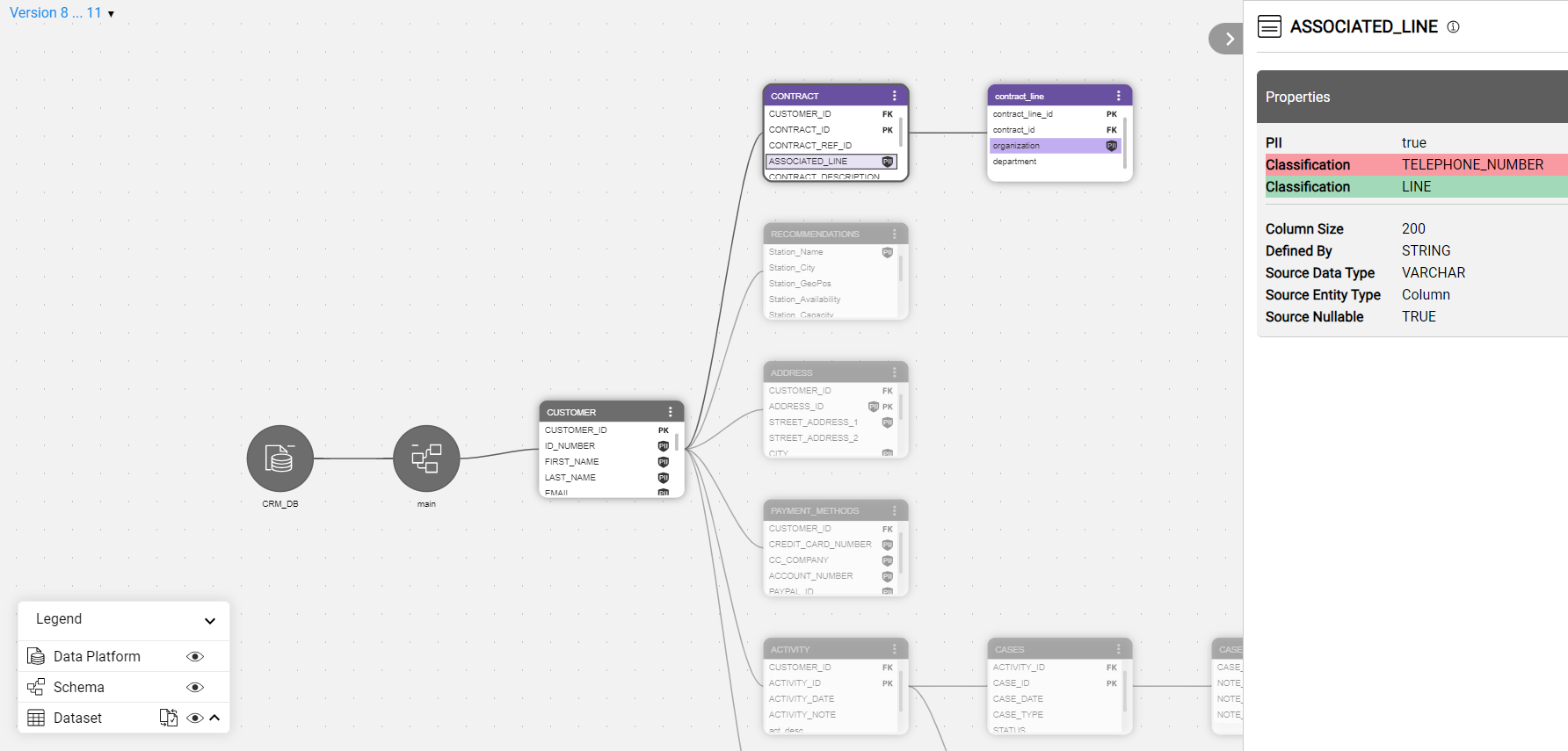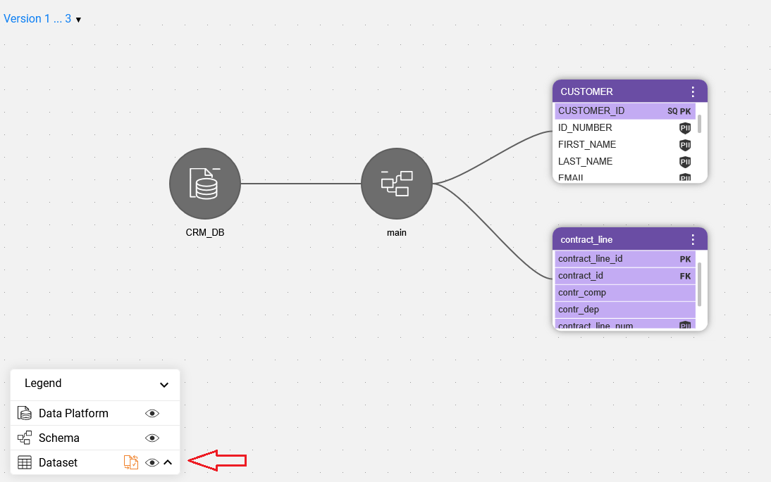 When a schema contains many datasets, it might be difficult to spot which ones were updated. To view only the differences between versions, start by expanding the schema and then click the 'Show differences only' icon in the Catalog legend. Note that this icon is visible only in version comparison mode.