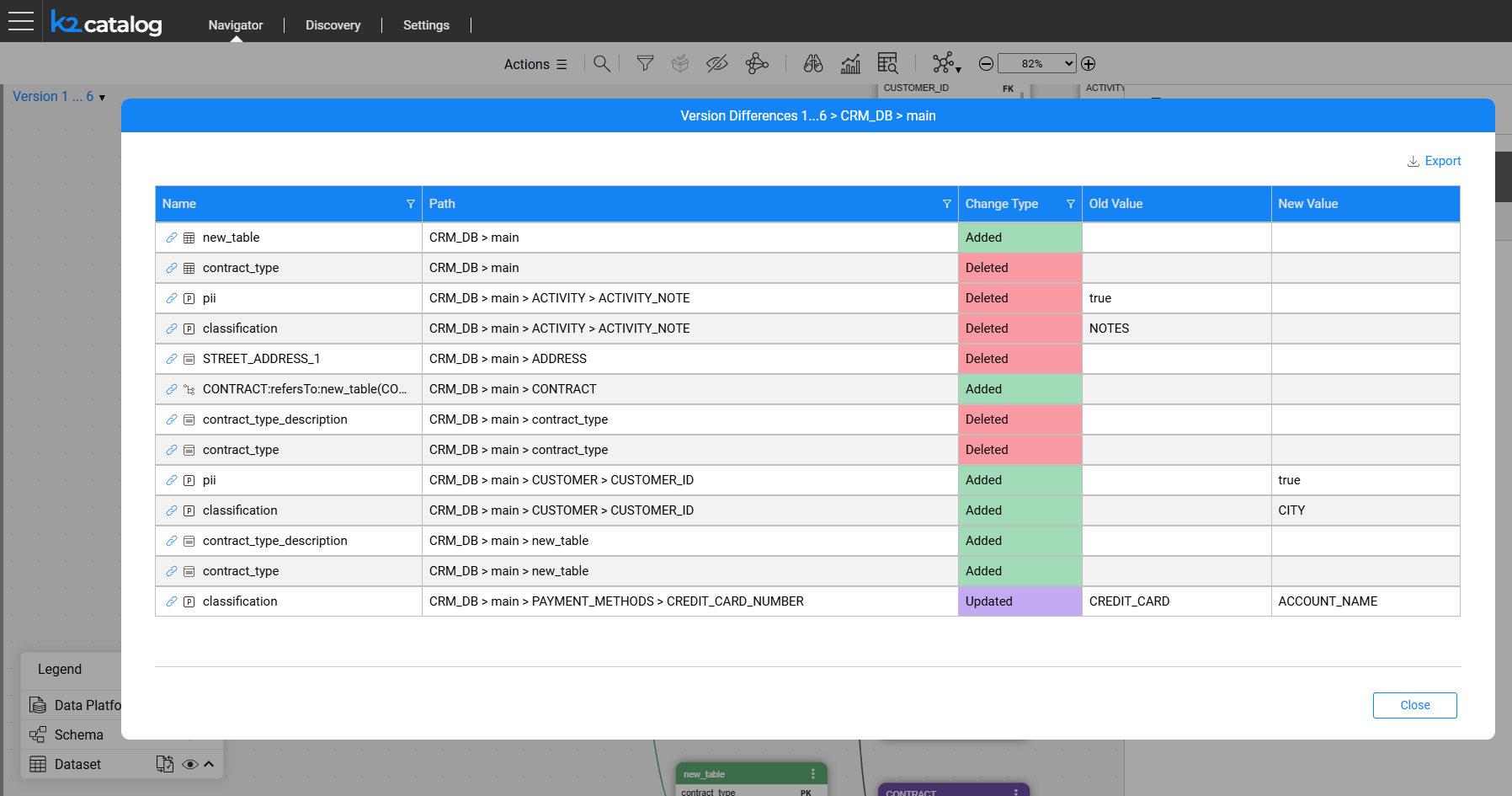 Every time the Discovery job is executed, it compares the current results with the previous Catalog version of the same data platform. The differences may result from changes in the data source (such as a new table or field) or from configuration updates, such as adding a new profiling rule or modifying an existing one.