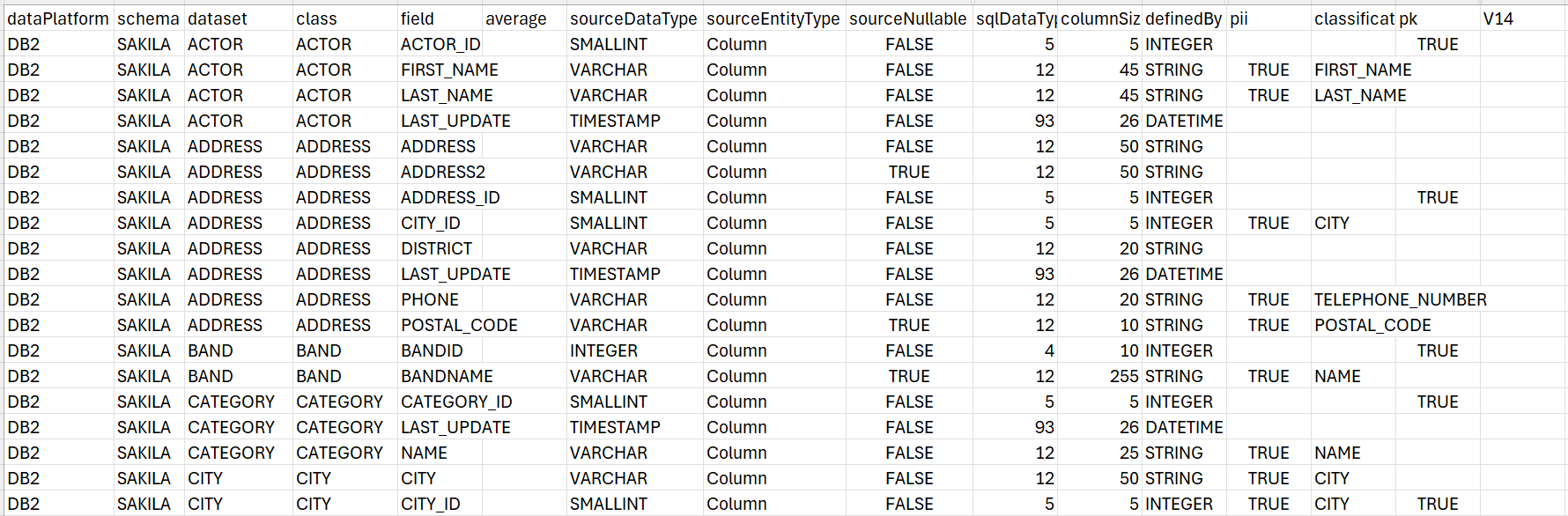 catalog_field_info___<dataPlatform>_<schema>.csv, (containing 3 underscores before the data platform name).catalog_relations_info___<dataPlatform>_<schema>.csv, (containing 3 underscores before the data platform name). It includes a list of refersTo relations with their properties (parent info, child info, origin). Note that these files are generated only from V8.3.1 onward.The below image is an example of a catalog_field_info___DB2_sakila.csv file: