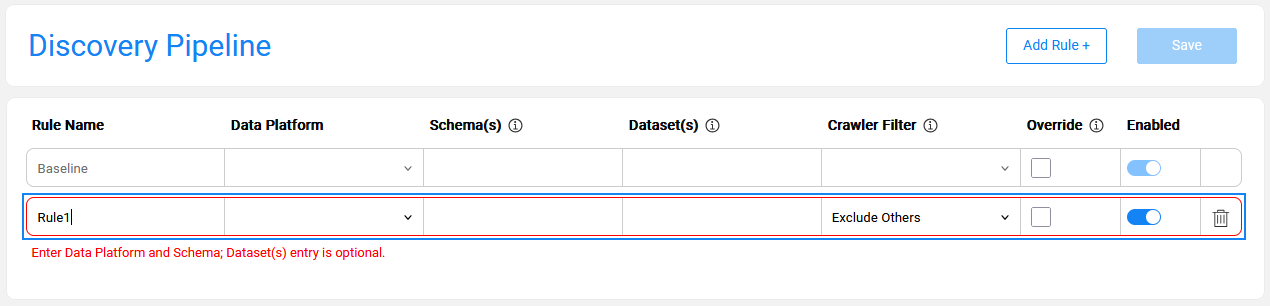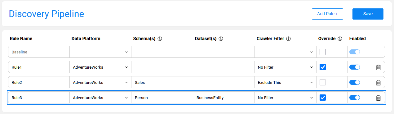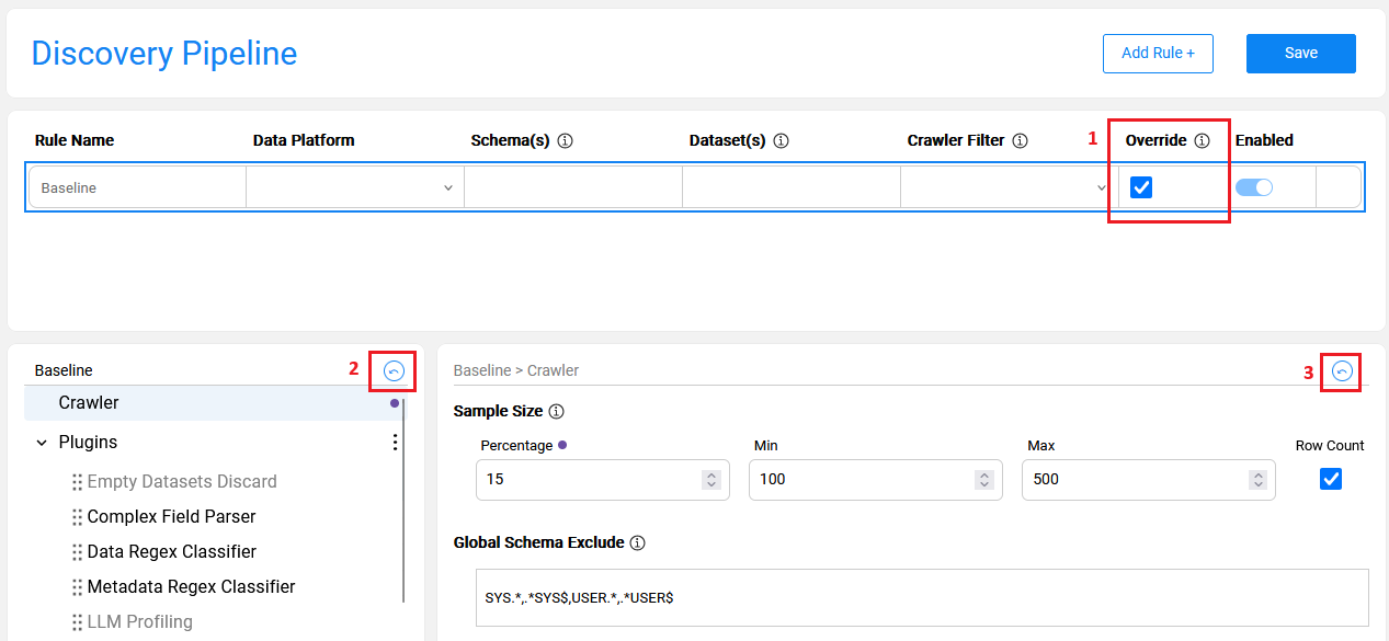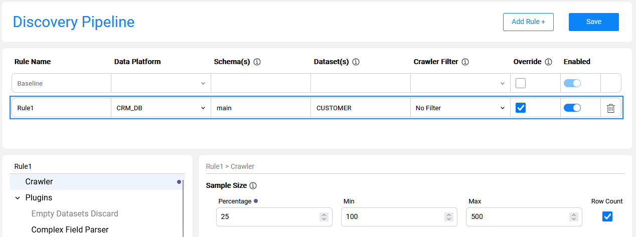 Multiple rules can be defined for the same data platform. The purpose of creating multiple rules is to allow variations of the Discovery process execution for different elements. For example, one may need to set a larger sample size for some datasets or execute a specific plugin on a designated dataset or schema.