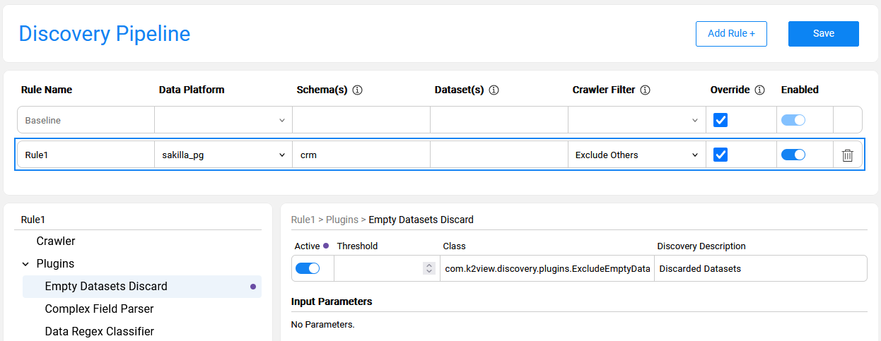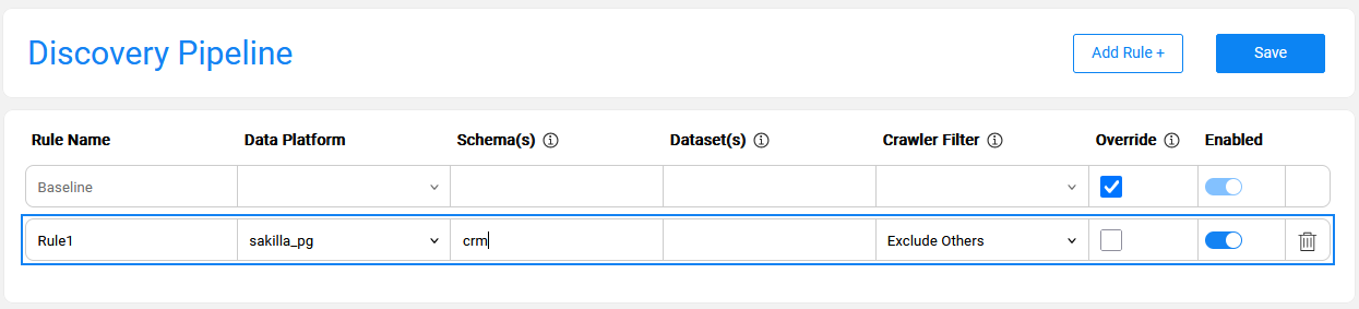 The below image presents a rule defined for sakilla_pg data platform and crm schema. The purpose of this rule is to limit the Discovery process to crm schema only, since sakilla_pg includes multiple schemas that are irrelevant for the current run. In addition to the filter, the rule also defines a baseline override by setting one of the inactive plugins to 'active'.
