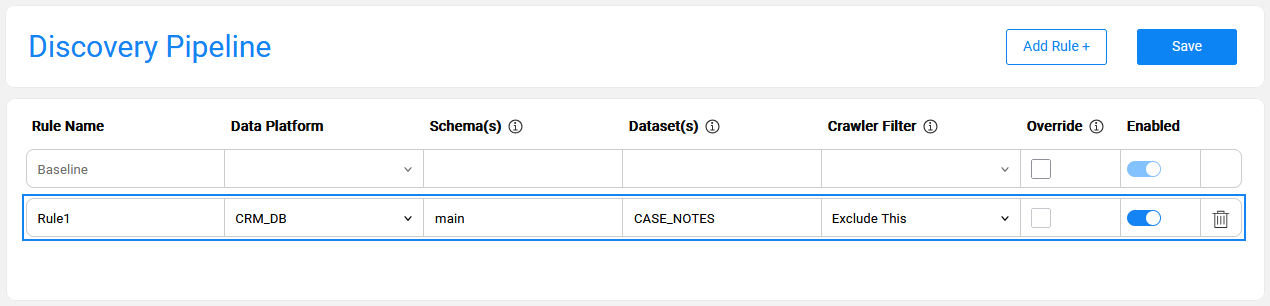 The below image presents a rule that excludes the CASE_NOTES table of the CRM_DB data platform and the main schema from the Discovery process. This means that discovery runs on all CRM_DB tables except CASE_NOTES.