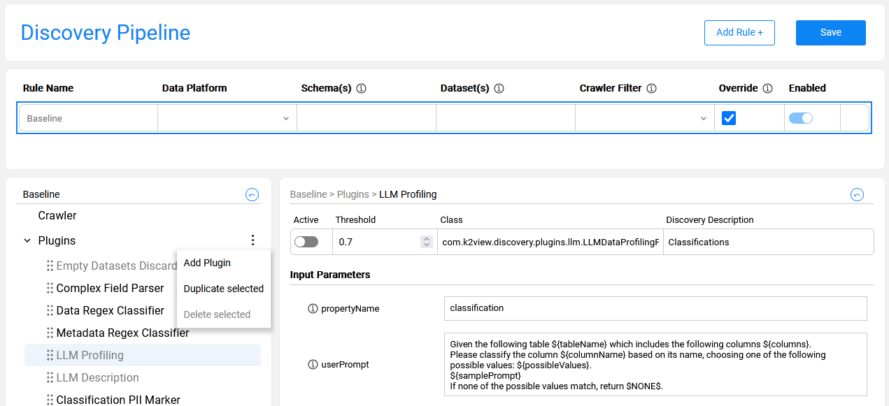 When a new plugin is created in a project, it should be added to the Baseline rule in order to be included in the Discovery job execution. Once added to the baseline, the new plugin is automatically propagated to all existing rules and can have different settings in each.